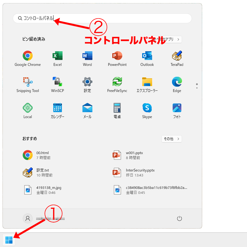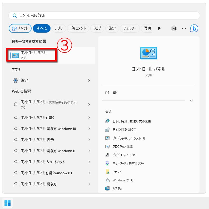 ② 検索バーに「コントロールパネル」を入力