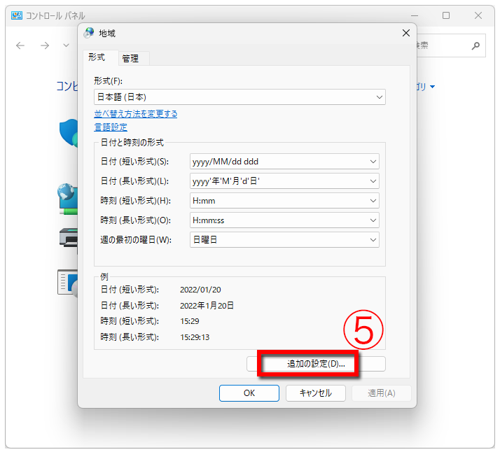 ⑤ 「追加の設定」ボタンをクリック