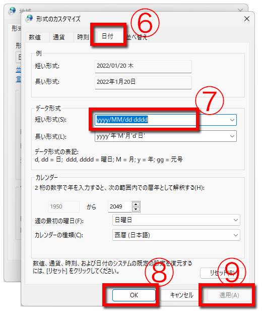 ⑦ OKをクリックし、⑧適用をクリックで完了です。