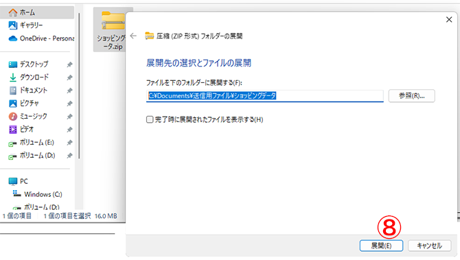 圧縮データの解凍先