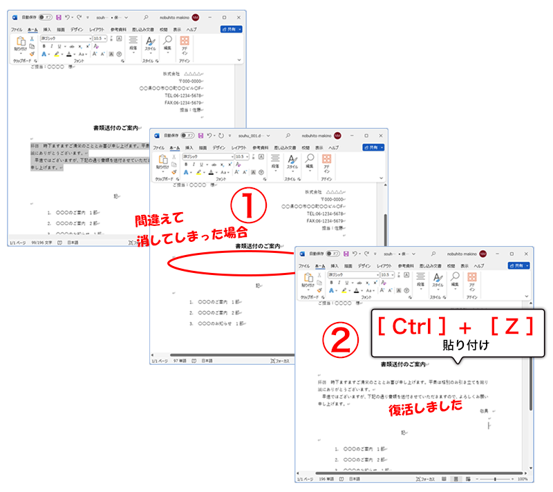 直前の操作を元に戻す(Windowsの操作を1つ前の状態に戻すことができます) Windows11 2023.10.282024.06.11 はじめに キーボードで操作すると圧倒的に操作効率が上がります。 小指を [ Ctrl ] キーに添えて 操作は全て人差し指でOKです。 操作を間違えた場合に直前の状態に戻します。 1 直前の操作を元に戻す [ Ctrl ] + [ Z ][ Ctrl ]キーを押しながら [ Z ]キー をクリック ① 操作を誤った場合。② [ Ctrl ] + [ Z ] ( [ Ctrl ]キーを押しながら [ Z ]キー をクリック) 元に戻りました。