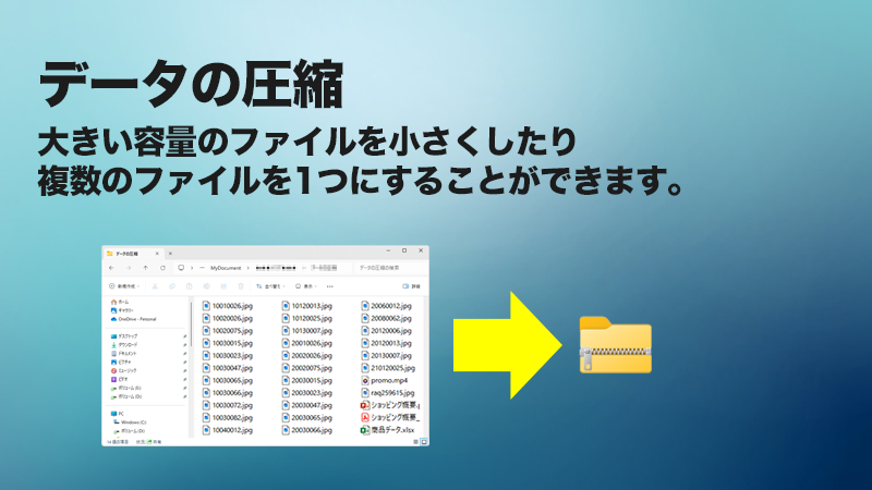 データ圧縮のメリットは、記録されている情報を失わずに複数のファイルを1つにまとめたり大きいファイルを小さくすることができるので、デ-タの受け渡し時には欠かせません。