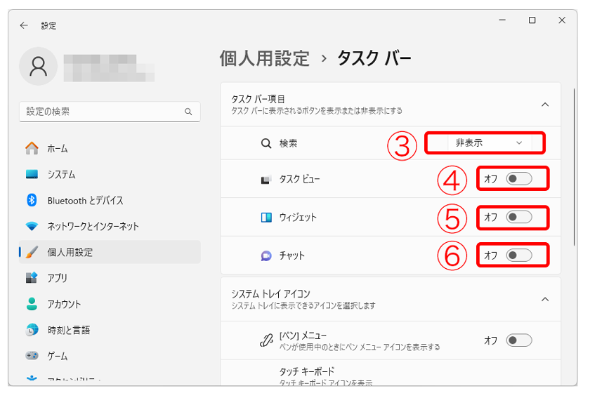 Windows11 スピードアップ(タスクバー編) Windows11 2023.11.272024.06.11 はじめに 普段使ってない機能を停止してWindowsのスピードをアップ 1 ①タスクバーの空欄でマウスの右クリック②「タクスバー設定」をクリック 2 ③非表示を選択④オフを選択⑤オフを選択⑥オフを選択 完成