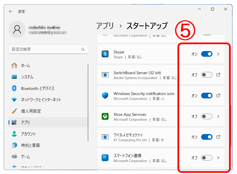 ⑤パソコン起動時に自動的に起動するアプリがオンになっています。