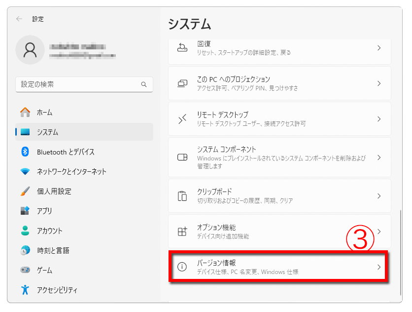 ③ 「バージョン情報」をクリック