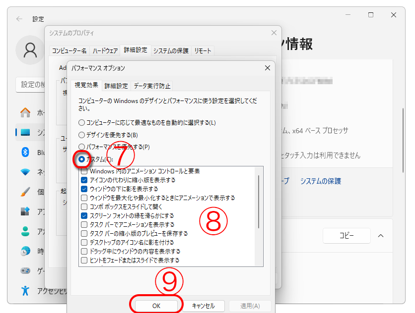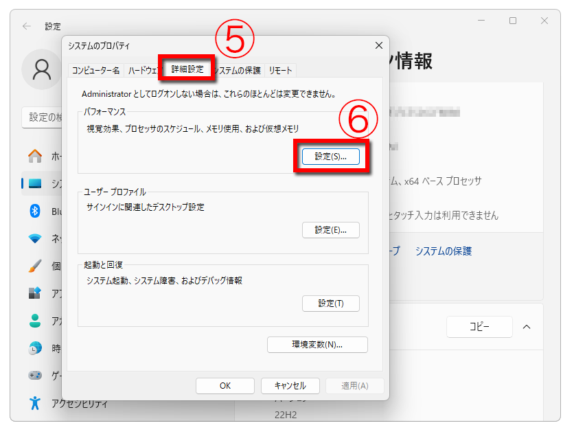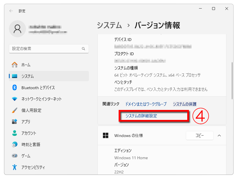 ④「システムの詳細設定」をクリック
